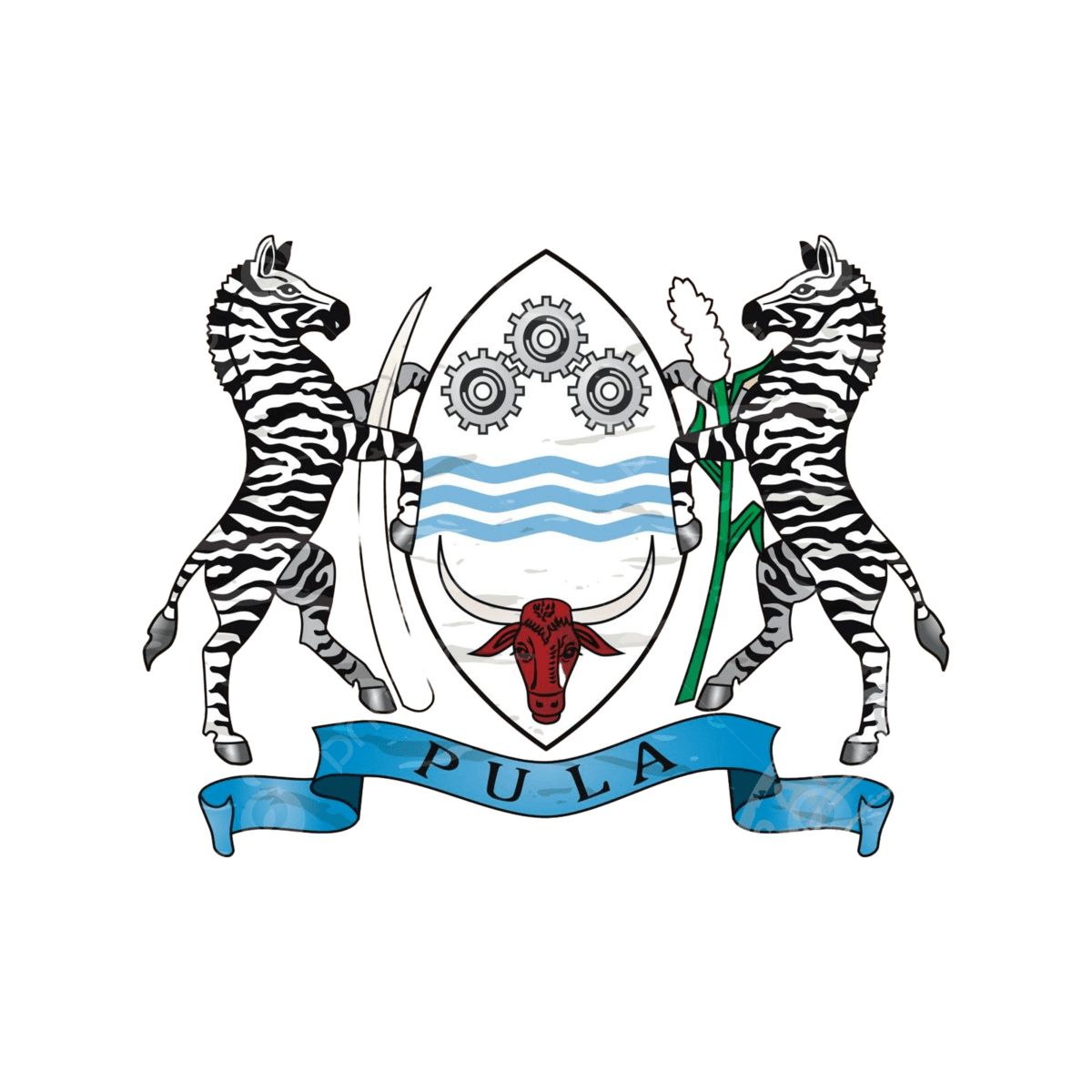 The bull’s head represents the importance of the cattle industry to Botswana’s economy and heritage. The cogwheels and sorghum stalks symbolize industry and agriculture, while three wavy blue lines represent the value of water. The zebra supporters reflect Botswana’s rich wildlife, and the national motto “Pula” — meaning rain and prosperity — anchors the design.