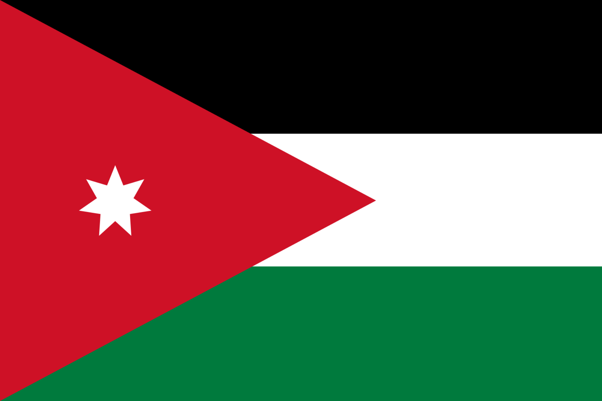 The flag of Jordan features three horizontal stripes of black, white, and green, representing the Abbasid, Umayyad, and Fatimid caliphates, respectively. A red triangle on the left side symbolizes the Arab Revolt against the Ottoman Empire. Inside the triangle is a white seven-pointed star, representing unity and the seven verses of the opening chapter of the Quran.